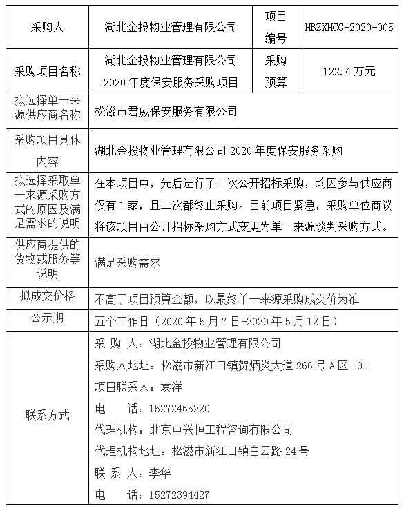 湖北金投物业管理有限公司2020年度保安服务采购《拟采用单一来源采购方式公告》