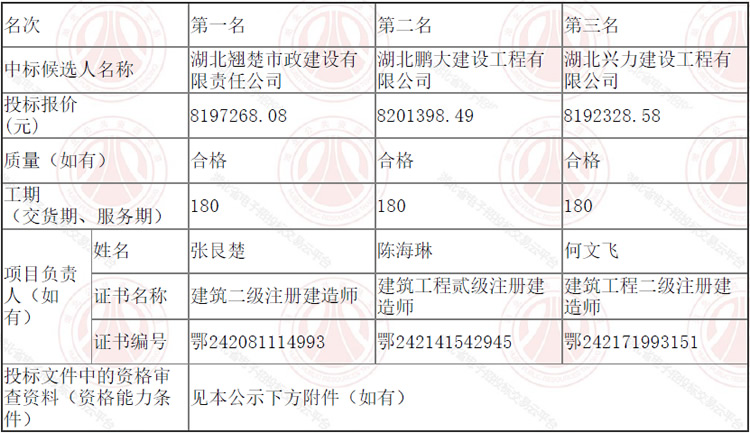松滋市乡镇人才公寓建设项目松滋市乡镇人才公寓建设项目第三标段(王家桥镇)于2022年07月16日在湖北省电子招投标交易平台发布招标公告,2022年08月09日在松滋市开标室(1)开标,并于2022年08月09日完成评标工作。根据评标委员会提交的评标报告,松滋金投商业开发有限公司已经确认评标结果,现进行评标结果公示。