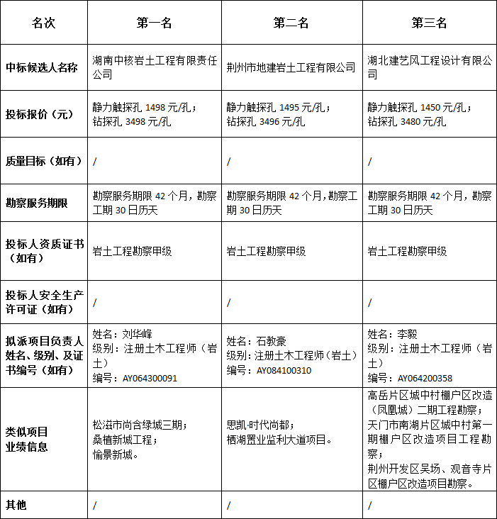 松滋市金投•划子嘴幸福家园安置小区及配套设施建设项目勘察于2018年11月24日在湖北公共资源交易信息网发布招标公告,2018年12月21日在松滋市公共资源交易中心开标。根据评标委员会提交的报告,松滋市金投•划子嘴幸福家园安置小区及配套设施建设项目勘察已经确认开标结果,现进行中标候选人公示。
