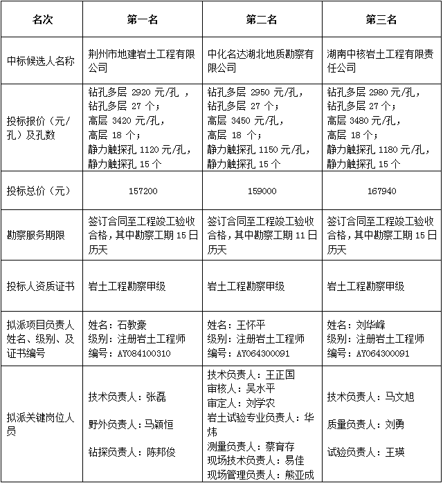 松滋市人才公寓建设项目勘察于2018年12月29日在松滋金投商业开发有限公司发布投标邀请书,2019年1月5日在松滋市BEATS365官网开评标室开标。根据评标委员会提交的报告,松滋金投商业开发有限公司已经确认开标结果,现进行中标候选人公示。